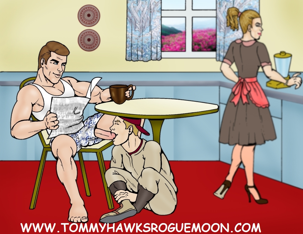 As his wife worked on the dishes, James pretended to read the paper, the vision of the nonchalant husband starting his weekend off work, just enjoying his day, while underneath, his son was working his pud with a smooth, steady motion. Those lips knew just how to handle his father's dong to wring the most pleasure for the big stud who had fathered him. "An all-American family, that's us." James grunted as his cock sparked with building passion.